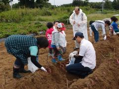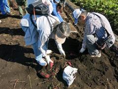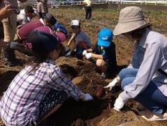 最後は畑に移動して、生産者のお話を聴きお待ちかねのサツマイモ掘り。大きなサツマイモを掘り当てると歓声がわき起こり、大人もこどもも楽しみました。