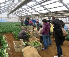 東方農業専用地区では、JA横浜の直売所で市内産農産物の買い物、ホウレンソウ・コマツナの生産について農家の方の話を聞き、コマツナの出荷調整作業の様子も見学させていただきました。なかなか入ることのできない温室の中も見ることができました。