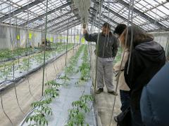 今回は、その中の池辺農業専用地区を見学しました。温室でトマト栽培を行う生産者の方と花卉栽培を行う生産者の方のお話を実際にハウスの見学をさせていただきながらお聞きしました。土がない、水耕で栽培されるトマトを見て参加者の方からは驚きの声がありました。
