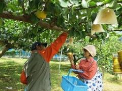 その後、環境活動支援センター内のほ場で、ナシとブドウの収穫を体験していただきました。