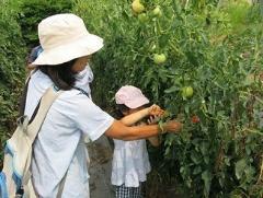 住宅地に囲まれた生産緑地の畑でトマトを収穫しました。農家さんからは、近隣住民に気を使って農薬を極力使用しないで栽培していること、食農教育など出来る限り地域貢献しているお話を伺いました。