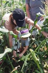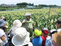 まずは、真っ青な空の下に広がるトウモロコシ畑へ。生産者からトウモロコシのおいしい食べ方やアライグマによる被害の話を聞いた後に、収穫体験。大人も子どもも笑顔いっぱいになりました。