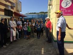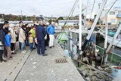 最初に柴漁港を訪問し、漁業協同組合柴支所長の案内のもと、小型底びき網漁船や出荷作業場、漁港直営食堂「小柴のどんぶりや」などの漁港施設を見学した後、ビデオを観ながら漁業の説明をしていただきました。地元漁師さんたちから「小柴」の名称に誇りを持っていること、地元で穴子がよく獲れること、底びき網漁船で多くの種類の魚が獲れること等の興味深い話がありました。