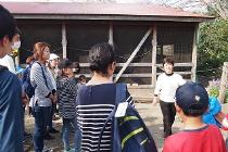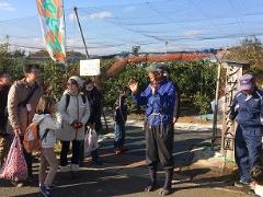 サトイモ収穫体験の畑に向かう途中、生産者から梅や柿の栽培、たい肥作り、土壌微生物を生かすために農薬を控えていることなどについて園内各所で丁寧な説明がありました。参加者は熱心に聞き入っていました。
