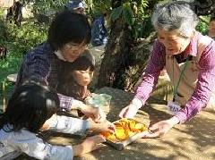 今回は親子を対象に、舞岡ふるさと村にある「かねこふぁ~む」を訪れ、農園見学、サトイモ収穫体験、干し柿づくり講座を行いました。
