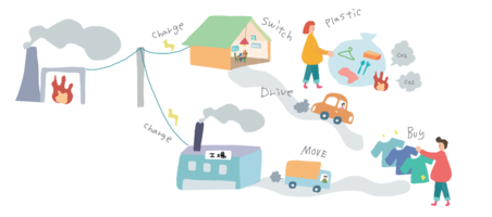 発電された電気を使うこと、電気を使ってつくられた製品を買うことは、CO2の排出につながっています。