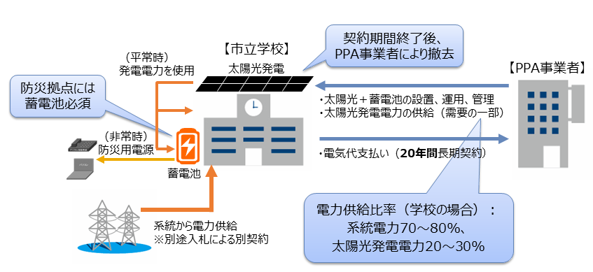 設備設置事業者が公共施設に太陽光発電設備・蓄電池設備を設置し、施設側は設備で発電した電気を購入する契約のことで、施設側は設備を所有しないため、初期費用の負担や設備の維持管理をすることなく、再生可能エネルギーの電気を使用することを可能とする取組です。