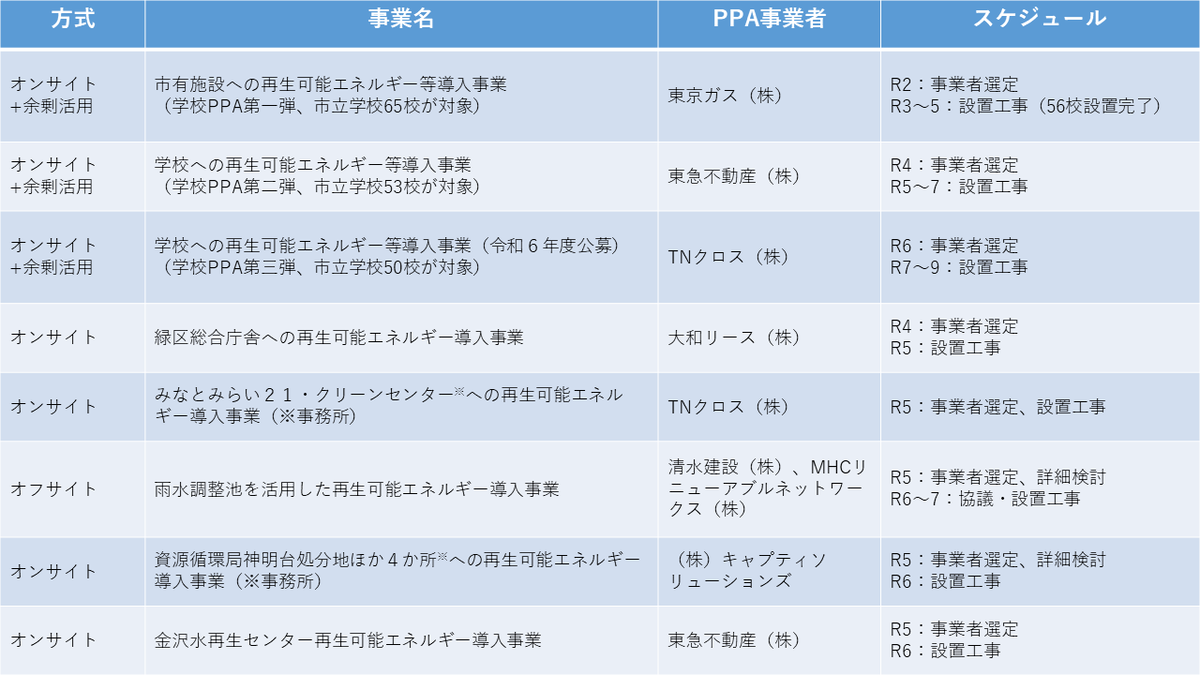 横浜市の目指す将来像として掲げる2050年までの脱炭素化の実現に向けて、市内最大級の温室効果ガス排出事業者である横浜市は、排出削減に率先して取り組んでいます。その取組のひとつとして、再生可能エネルギー設備の更なる導入が掲げられており、公共施設の新築・増改築にあたっては、原則として太陽光発電設備などの再生可能エネルギー設備を導入する必要があり、その導入にあたってはPPA事業等を活用して進めていくこととしています。