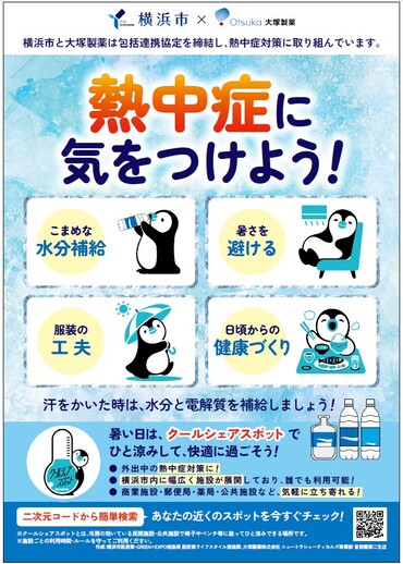 熱中症を予防するためには、 適切な室内温度調整や水分・塩分補給、暑い日の外出を控える等が基本となりますが、外出せざるを得ない場合には、熱中症のリスクを低減する取組が重要です。そこで、横浜市では、令和5年夏から市民の皆様が外出時に一時的に暑さをしのぐ場として利用可能な市民利用施設を、クールシェアスポットとしてウェブページで公表を行っています。