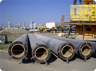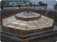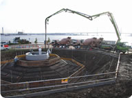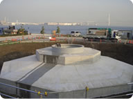 この基礎に使用されたコンクリートの量は、約530立方メートル。生コン車(コンクリートミキサー車)延べ106台により運搬され、打設しました。