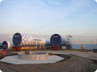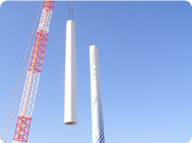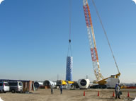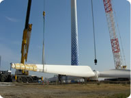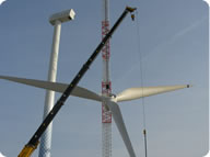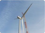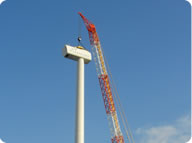 トップ(3段目)のタワーを設置したあと、68トンあるナセルを取り付けました。風車の組立に使用しているクレーンは、当時、世界に2台しかないという、ドイツ製の800トンクレーン車です。