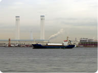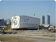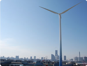ハマウィング(横浜市風力発電所)は、風車建設の構想開始から5年の歳月を経て、横浜港瑞穂ふ頭に完成しました。日本では珍しい「都市型風車」として、多くの市民の憩いの場である、みなとみらい地区からその姿を目にすることができます。当時、国産の2メガワット級の風車がまだ無かったこともあり、デンマークの現ベスタス社製が選定され、タワーは韓国で、ブレードは中国で、ナセルはデンマークでそれぞれ製造されたのち、海を渡って日本の横浜港まで運ばれてきました。