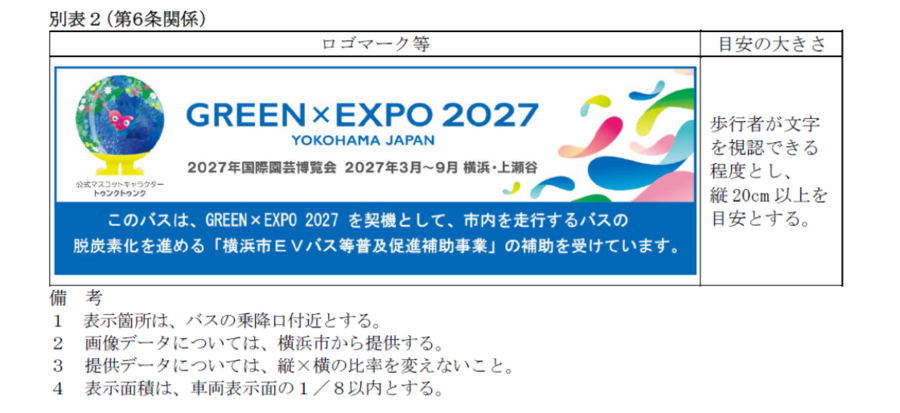 (5)GREEN×EXPO 2027の機運醸成を図るため、GREEN×EXPO 2027終了時まで、別表2に示すロゴマーク等を車体に表示するなどしてPRすること。ただし、ロゴマーク等の表示ができない場合は、その対応について市長と協議することとする。
