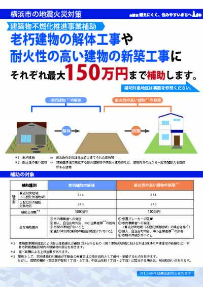 キーワード:横浜市、解体、新築、建替え、補助金、助成金、エリア限定、重点対策地域=不燃化推進地域、最大150万円