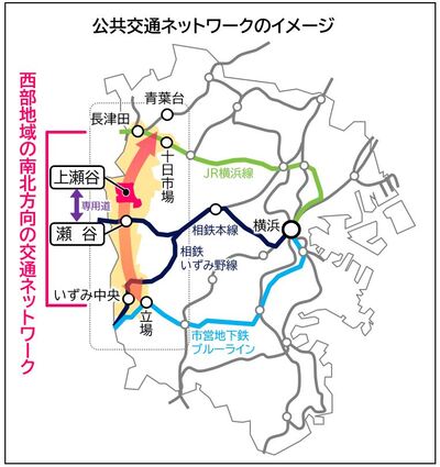 瀬谷と上瀬谷間での新たな輸送システムの導入や、周辺道路を活用した複数の鉄道路線とつながるバス路線の充実などにより、本市西部地域の交通ネットワークの構築を目指します。