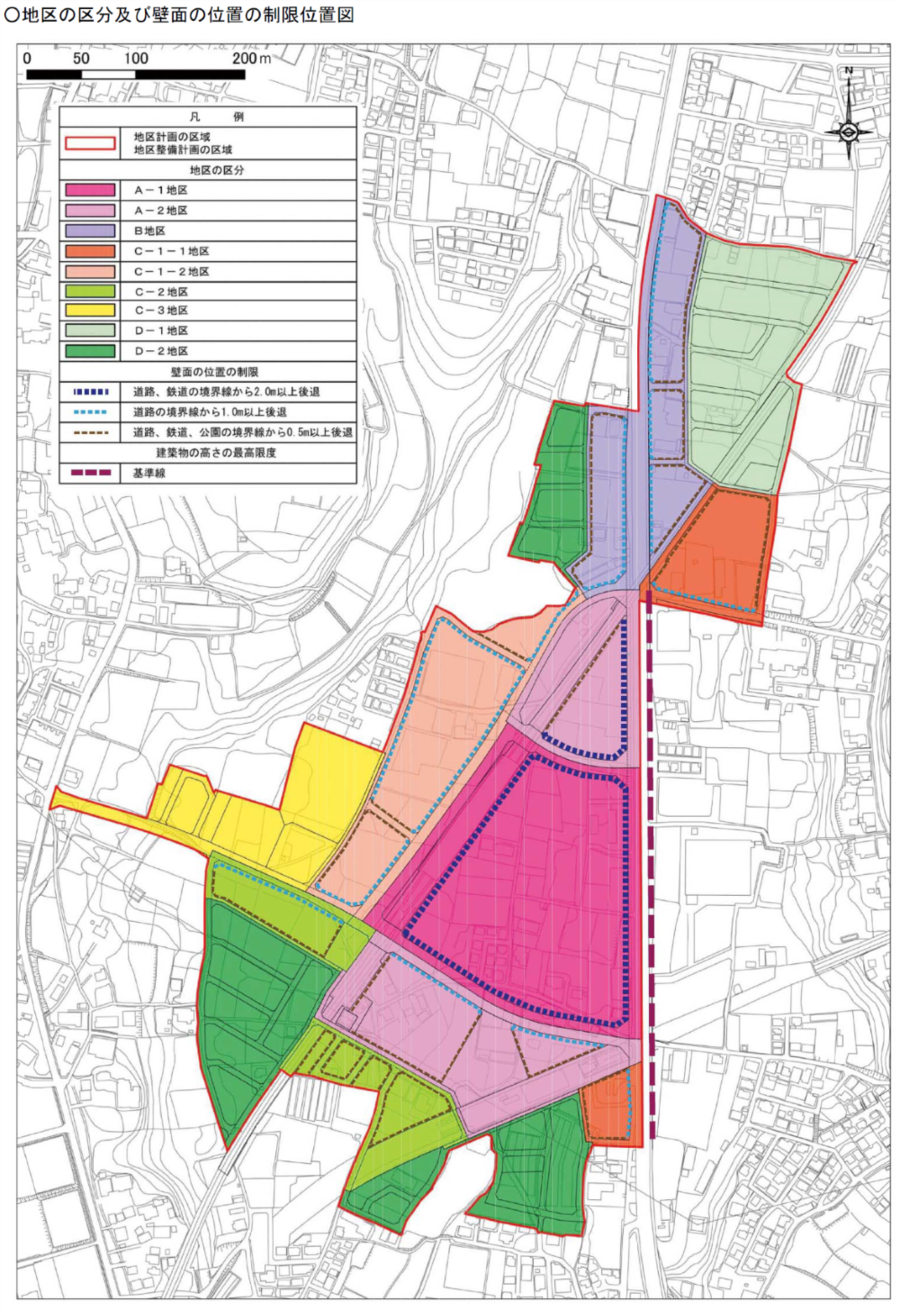 計画図(地区の区分、壁面の位置の制限、建築物の高さの最高限度)