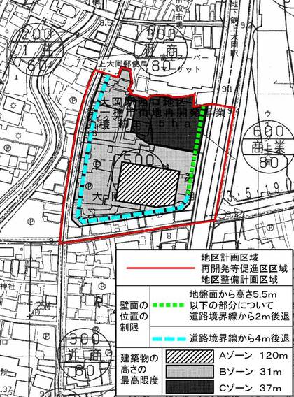 | 建築物の高さの最高限度 | Aゾーン 120m Bゾーン 31m Cゾーン 37m |