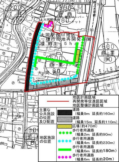 | 主要な公共施設の配置及び規模 | 道路 | 幅員 約 9m 延長 約160m 幅員 約15m 延長 約110m |