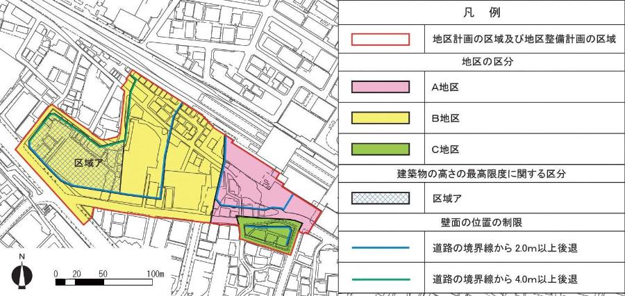 計画図(地区の区分、建築物の高さの最高限度に関する区分、壁面の位置の制限)