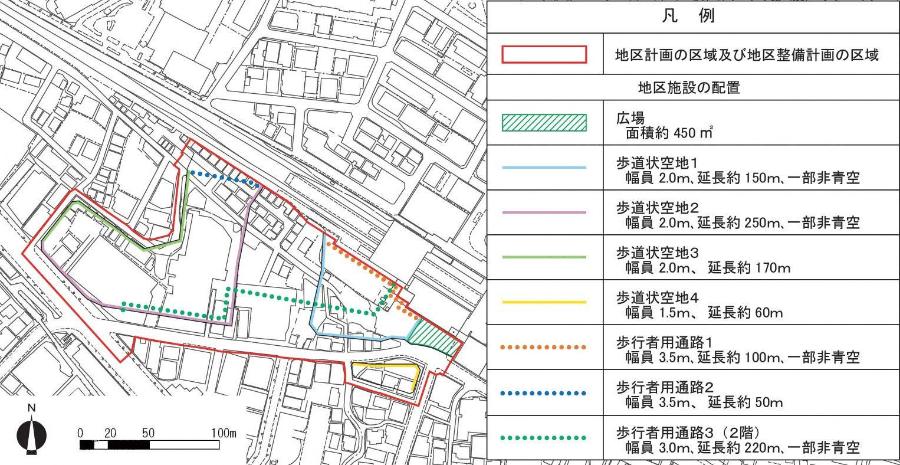 | 地区施設の整備の方針 | 1 にぎわいのある都市空間の形成と防災性の向上を図るため、人々の憩い・交流・たまりの場となり、災害時における一時的な避難場所となる広場を整備する。 2 駅と周辺を結ぶ安全で快適な歩行者空間を確保するため、歩道状空地1、歩道状空地2、歩道状空地3及び歩道状空地4を整備する。 3 鉄道及びバス利用者や駅周辺施設利用者の利便性向上のため、駅と駅前広場をつなぐ歩行者用通路1を整備する。周辺の住宅地等へつながる歩行者空間を確保するため、駅前広場と地区西側区画道路をつなぐ歩行者用通路2を整備する。駅を利用する歩行者の利便性と安全性の向上のため、駅と台村町交差点を2階レベルでつなぐ歩行者用通路3を整備する。 |