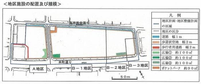 | 地区施設の整備の方針 | ゆとりと賑わいのある歩行者空間のネットワークの形成、港への見通し景観及び歴史を感じる憩いの空間を確保するため、道路、歩道状空地、歩行者用通路、広場とポケットパークを整備する。 | |