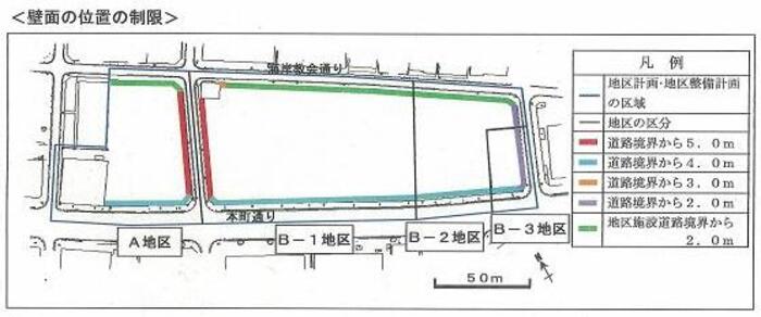 | 壁面の位置の制限 | 建築物の外壁又はこれに代わる柱の面は、計画図に示す壁面の位置の制限を超えて建築してはならない。 ただし、公衆便所、巡査派出所その他これらに類する公益上必要な建築物又は建築物の部分については、この限りでない。 |