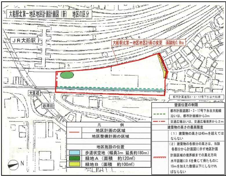 地区計画の目標 | 大船駅北第一地区は、横浜駅から南西約14.5km、栄区西方の柏尾川流域にあり、JR東日本「大船駅」の北側に位置している。 本地区は、都市計画道路3・3・17号下永谷大船線と鉄道敷に挟まれた南北に細長い形状をなしており、都市計画道路に面しては小規模な店舗や官公庁施設が立地する一方、鉄道敷に接する側は青空駐車場に利用されている等、大船駅に近接した立地にもかかわらず、充分な土地の高度利用が図られていない。 横浜市においては、本地区を含む大船駅北口地区を「中期政策プラン」において地域拠点として位置づけており、市民の日常生活に身近な拠点として機能強化を図ることとしている。 本地区計画は、大船駅周辺の総合的な整備の一環として、地区の活性化、土地の高度利用を図る再開発事業等を促進し、商業施設や住宅等の再整備を行うとともに、都市づくりの先導的整備として歩行者空間を中心とした都市基盤の改善を行い、横浜市の地域拠点にふさわしい市街地環境を創出することを目標とする。 |