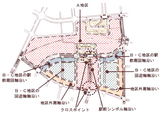 (2) 駅前シンボル軸沿いは、駅前にふさわしい賑わいとハイセンスな街並みを形成する駅前シンボルゾーンとする。また、駅前シンボル軸と駅前周回軸及び地区外周軸のクロスポイントは、街のゲート部分として、また街のクロスポイントとして演出を図ることが望ましいゾーンとする。