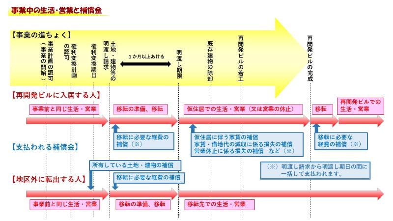 地区内の土地等の明渡しに伴い、権利者が通常受ける損失の補償として、仮住居補償、営業補償、動産移転補償、権利変換の対象とならない工作物や土石竹木の補償、移転に必要となる雑費等の補償などが支払われます。補償金の額は、通常の公共事業における補償基準などに基づき算出し、明渡しの期限までに支払われます。権利変換する権利者、転出する権利者のいずれもこの補償金の対象となります。なお、事業によっては施行者が仮住居や仮店舗を用意する場合もあります。