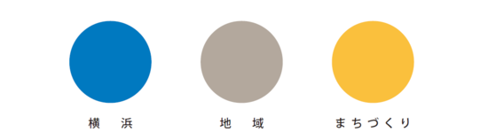 横浜のテーマカラーのブルー、地域を象徴する色として落ち着いたベージュ、まちづくりのポジティブで活動的なイメージを象徴する色としてイエローを設定しました。