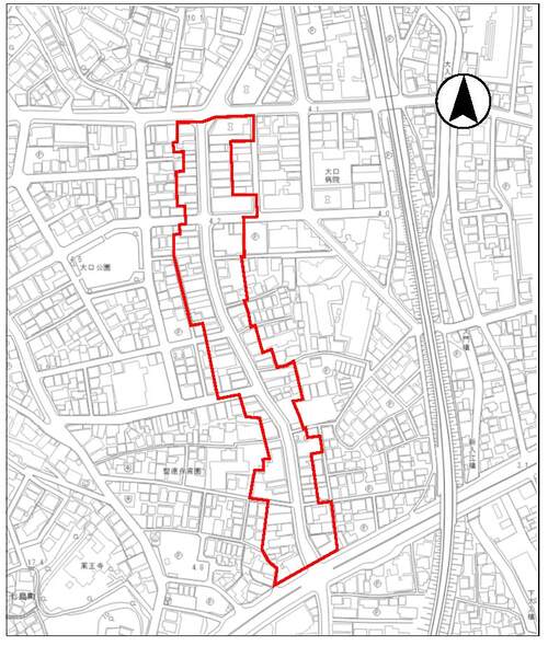 大口通に接する両側街区で、大口交差点から国道1号までの地域
