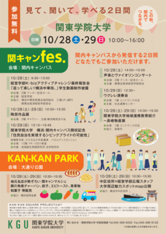 | 紹介 | 関東学院大学学生の成果発表や2つの自治体の市長を招いたシンポジウムのほか、長崎物産展等が実施される今年開校した関東学院大学横浜・関内キャンパスでの「関キャンFes.」に合わせて、大通り公園にて「KAN-KAN Park」を実施します。地元名店による、豚角煮チャーハンや餃子、エビトーストなどが並ぶキッチンカーも出店しました。 |