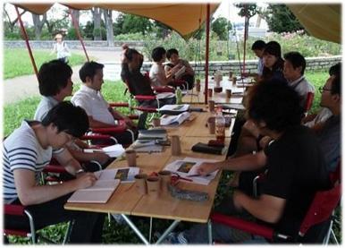 公共空間の有効活用を検討しているスタッフの打合せはアウトドア会議室で実践しようと野毛山公園や横浜市庁舎の駐車場の一画にアウトドア会議室を設置し、会議を実施しました。