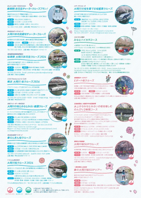 大岡川沿岸には桜が立ち並び、例年桜の季節は船上から桜を見る「お花見クルーズ」が多数実施されます。