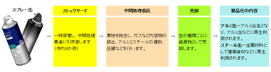 スプレー缶はアルミ缶や建築資材等に生まれ変わります。