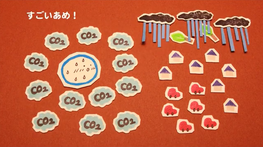 これは、地球温暖化の影響で、気候がおかしくなっていると⾔われているんだ。そして、地球温暖化は、わたしたちの⽣活にともなって発⽣する、⼆酸化炭素(CO2)などの温室効果ガスが原因とされているんだ。