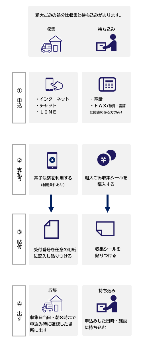 粗大ごみの処分は 収集と 持ち込み(自己搬入)があります。