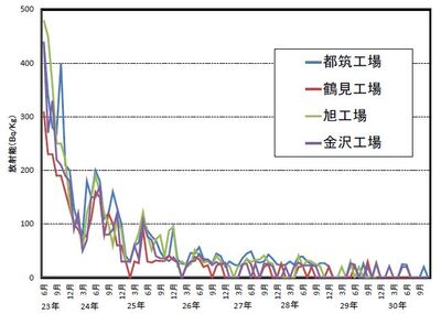- ごみ焼却工場で発生した焼却灰の放射性物質濃度は、継続して100Bq/kg(国が示した埋立基準は8,000Bq/kg)を下回っていることから、焼却工場(飛灰処理作業場所付近)における空間線量とあわせて、平成31年3月をもって測定を終了しました。