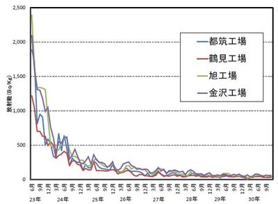 - 排ガス、凝集沈殿汚泥、再利用水及び放流水については放射性物質濃度の「不検出」が続いたため、平成29年3月をもって調査を終了しました。