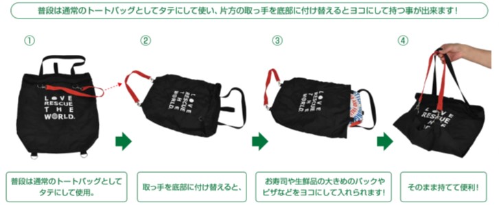 株式会社ステレオ・スキップのエコバッグは便利さを追求。普段は通常のトートバッグとしてタテにして使い、取っ手を付け替えると ヨコにして持つことができます。