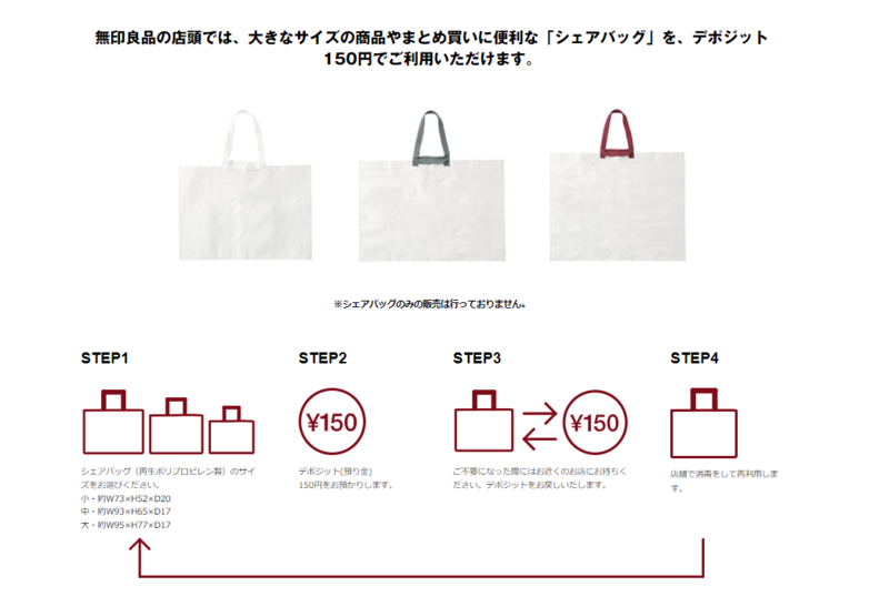 株式会社良品計画の展開する無印良品では、人と自然とのより良い関係を考え、地球のごみを減らすため、お買い上げ時にお渡しするレジ袋の削減に取り組んでいます。無印良品でのお買い物の際には、お持ち帰り用のマイバッグ持参にご協力をお願いしています。プラスチック製レジ袋を廃止し、有料で紙袋ショッピングバッグを販売しています。また、無印良品の店頭では、大きなサイズの商品やまとめ買いに便利な「シェアバッグ」を、デポジット150円でご利用いただけます。