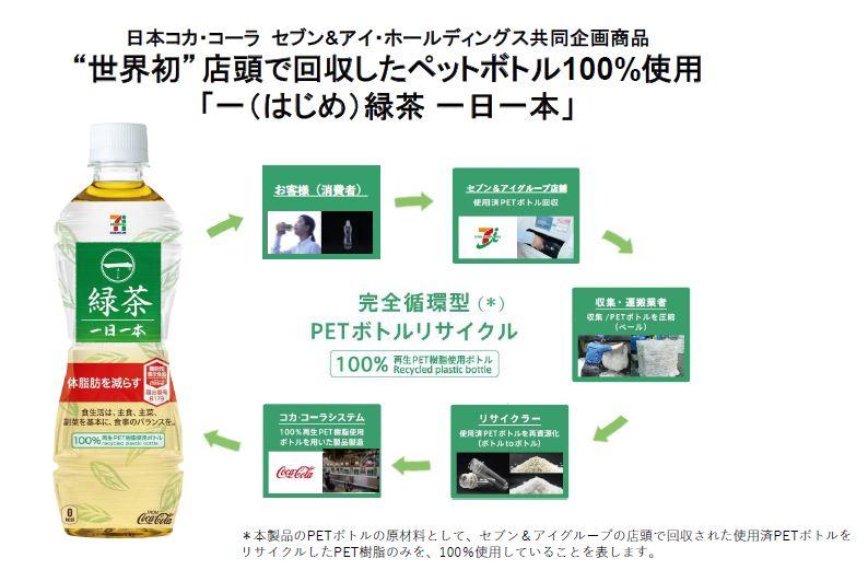 【“世界初“ 完全循環型ペットボトルリサイクルを実現】日本コカ・コーラ株式会社と株式会社セブン&アイ・ホールディングスとの共同企画商品「セブンプレミアム×一(はじめ)緑茶 一日一本」は、セブン&アイグループの店頭で回収したペットボトルのみを使用した100%リサイクルペットボトルの商品です。リサイクルする事によりプラスチックを有効活用した、環境にやさしい商品です。詳細はこちら: https://www.sej.co.jp/…/news_release/news/2019/20190605.html(外部サイト)