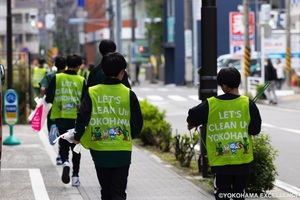 協定締結を記念して寄贈いただいたオリジナルビブスを着用し、横浜エクセレンスのホームアリーナがある関内駅周辺を清掃しました。