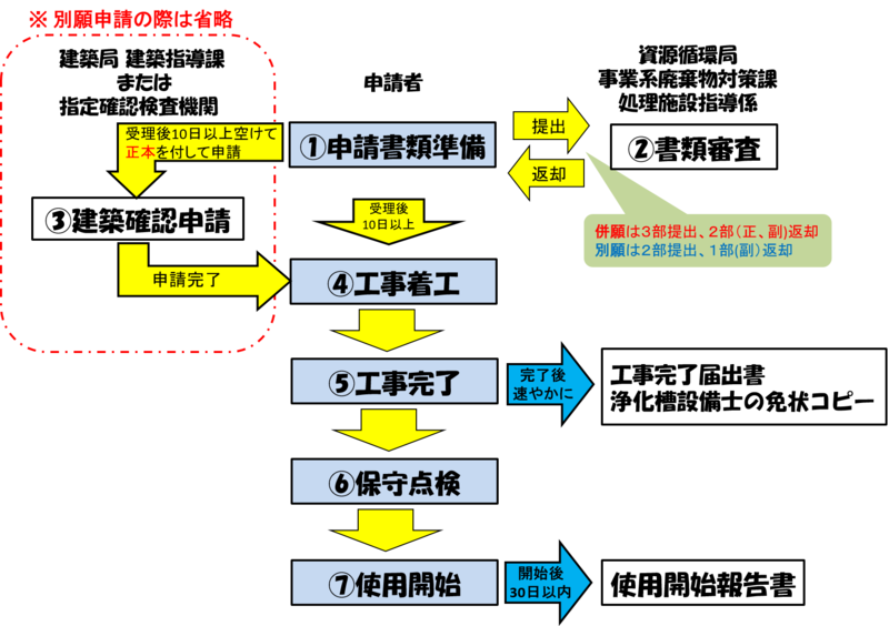 - 浄化槽の設置の手続には、建築確認を伴う建築併願浄化槽設置手続(以下「併願手続」)と