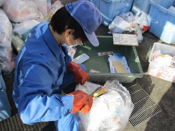出されたごみで分別されてないごみを一つ一つ調べていきます。