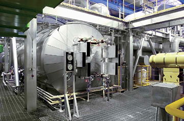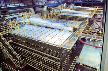 ボイラは、蒸気を発生させる大型の湯沸器のような装置です。圧力と温度を高めて取り出されます(約400℃、3.9MPa)。取り出された蒸気はごみ焼却に必要な熱源として利用されたり、蒸気タービン発電機で発電に利用されるほか、余熱利用施設(リネツ金沢)へ熱供給する為の熱源としても利用されています。
