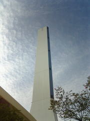 処理した排ガスを大気に放出するところです。高さ130mの煙突内部は、各焼却炉から1本ずつ合計3本の鋼製煙突が通っています。