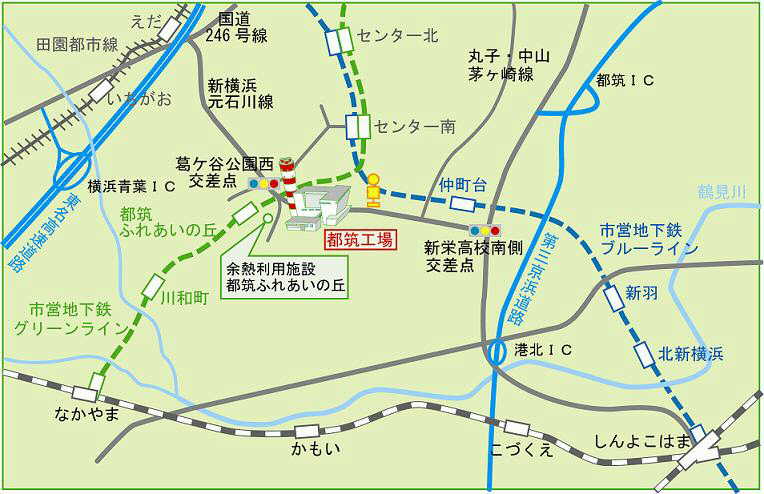 ・東急田園都市線江田駅下車→市営バス301系統→都筑工場前下車