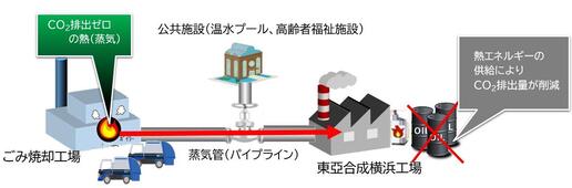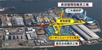 これは、鶴見工場でごみ焼却に伴い発生した蒸気を東亞合成株式会社横浜工場に供給し、化石燃料由来のエネルギー消費を、鶴見工場からのゼロCO2蒸気に置き換えることで、「二酸化炭素の排出量の削減およびその検証」を行うものです。