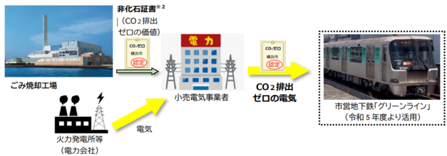 令和5年度からは、新たに横浜市営地下鉄「グリーンライン」においても「環境にやさしいエネルギー」を活用することで、「グリーンライン」はCO2を排出せずに運行しています。
